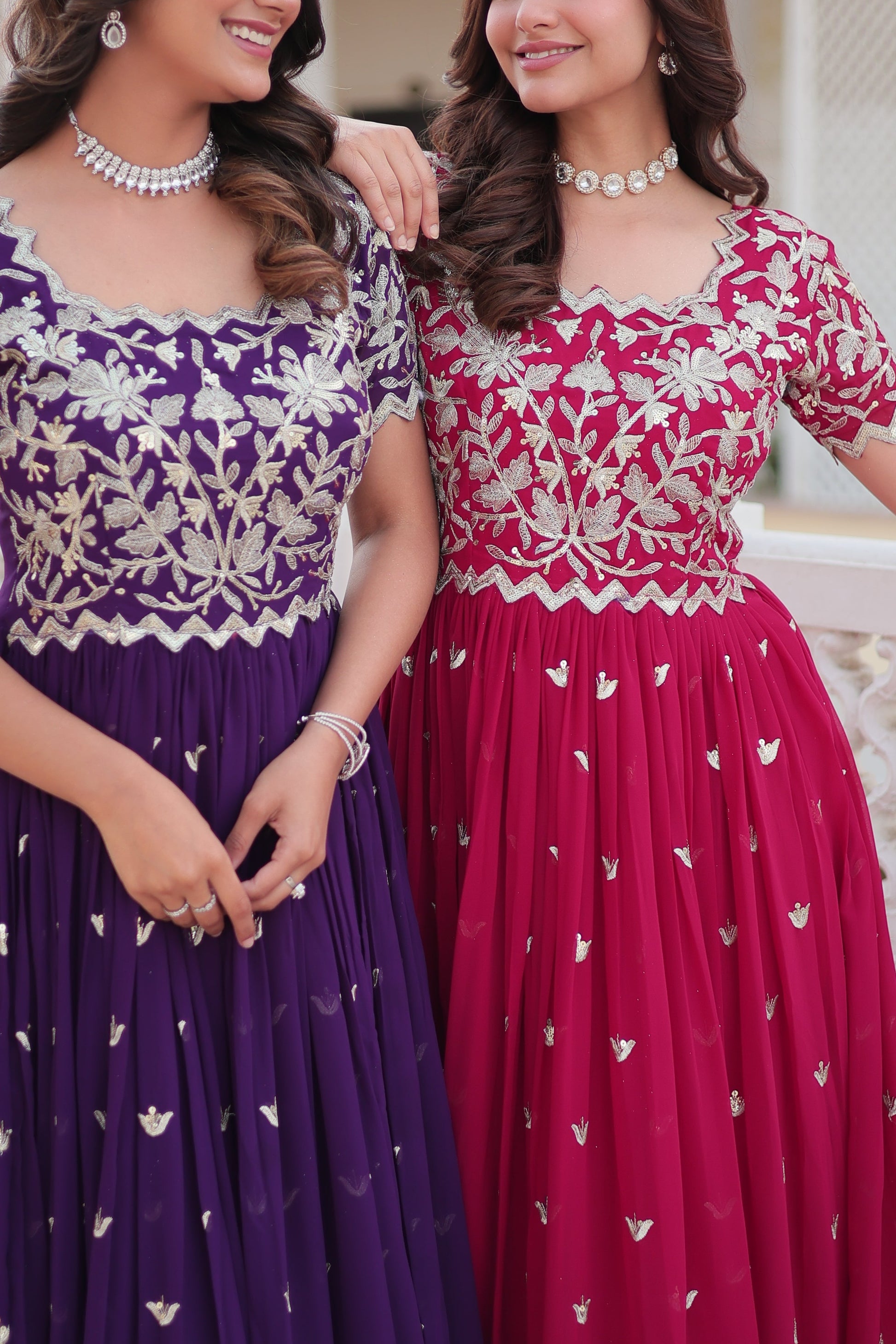 This elegant Faux Georgette Gown showcases the latest trend in women's fashion. With delicate coding sequins embroidery, it exudes sophistication and beauty. Perfect for any formal occasion, this gown is sure to make any woman feel aspirational and stylish.